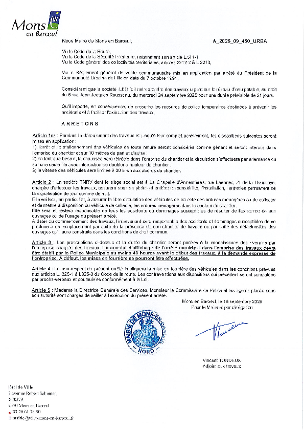 A2025-09-450 Restriction de stationnement Rue Jean Jacques Rousseau