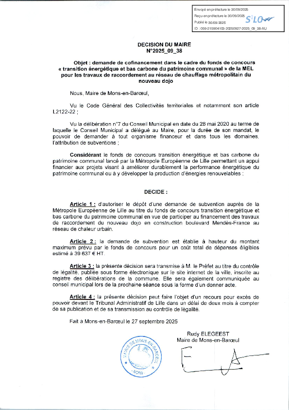 Demande de cofinancement dans le cadre du fonds de concours "Transition énergétique et bas carbone du patrimoine communal" de la MEL pour les travaux de raccordement au réseau de chauffage métropolitain du nouveau dojo