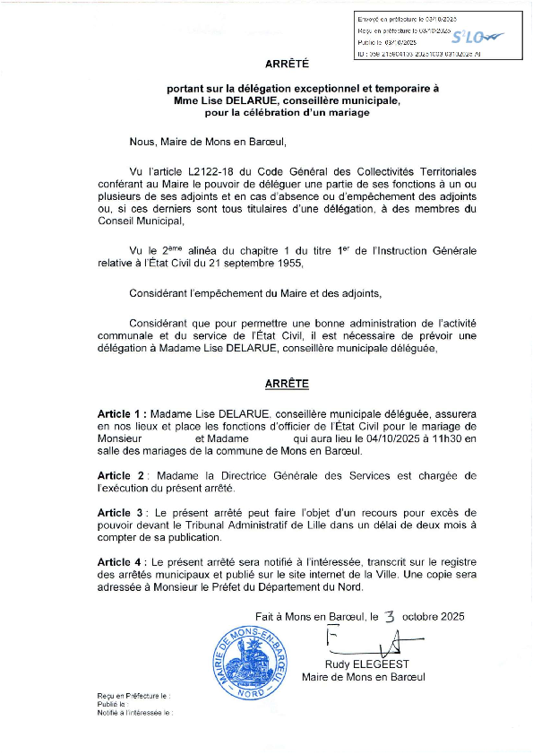 Délégation exceptionnel et temporaire à Mme Lise DELARUE, conseillère municipale pour la célébration d'un mariage