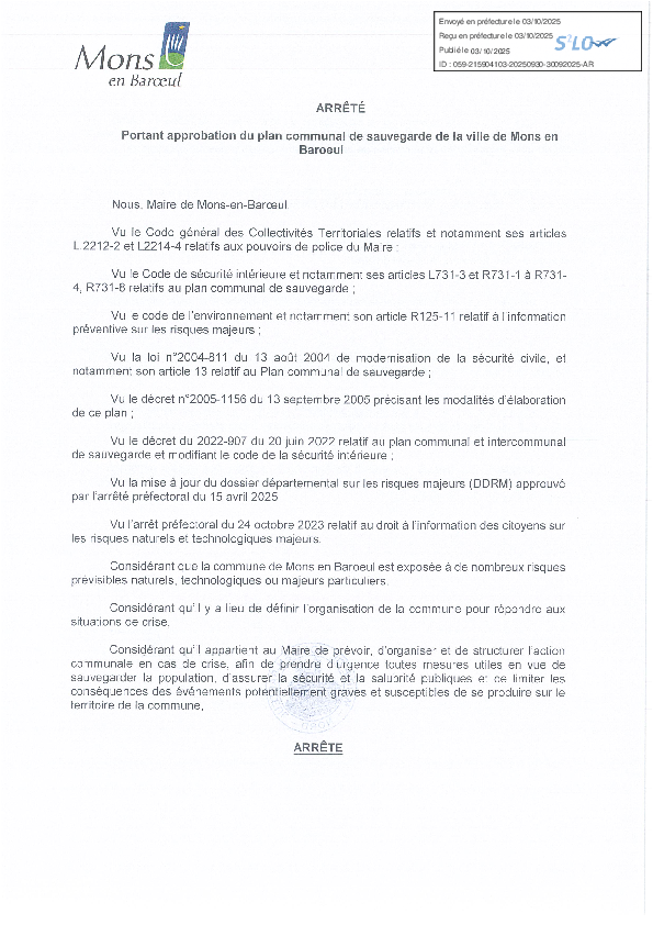 Approbation du Plan Communal de Sauvegarde de la Ville de Mons en Barœul