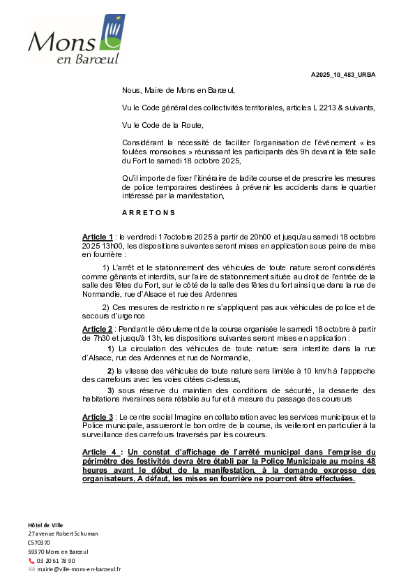 arrêté portant sur la fermeture provisoire du Fort de Mons en Baroeul