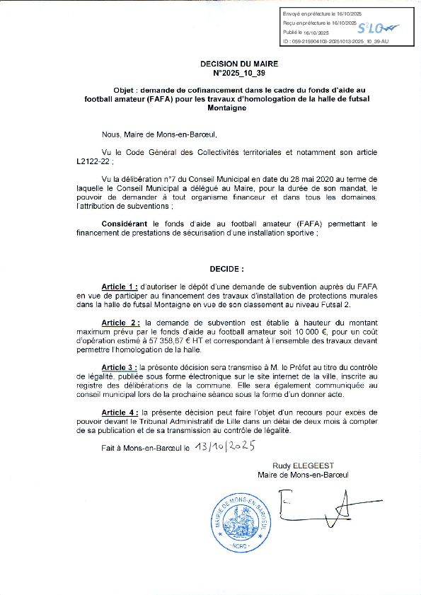 Demande de cofinancement dans le cadre du fonds d'aide au football amateur (FAFA) pour les travaux d'homologation de la halle de futsal Montaigne