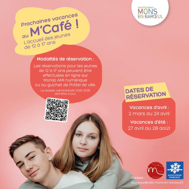 Pour les jeunes de 12 à 17 ans, les réservations pour les jeunes de 12 à 17 ans peuvent être effectuées en ligne sur Mon(s) AMI numérique ou au guichet de l’hôtel de ville. Les prochaines périodes de réservations sont les suivantes :