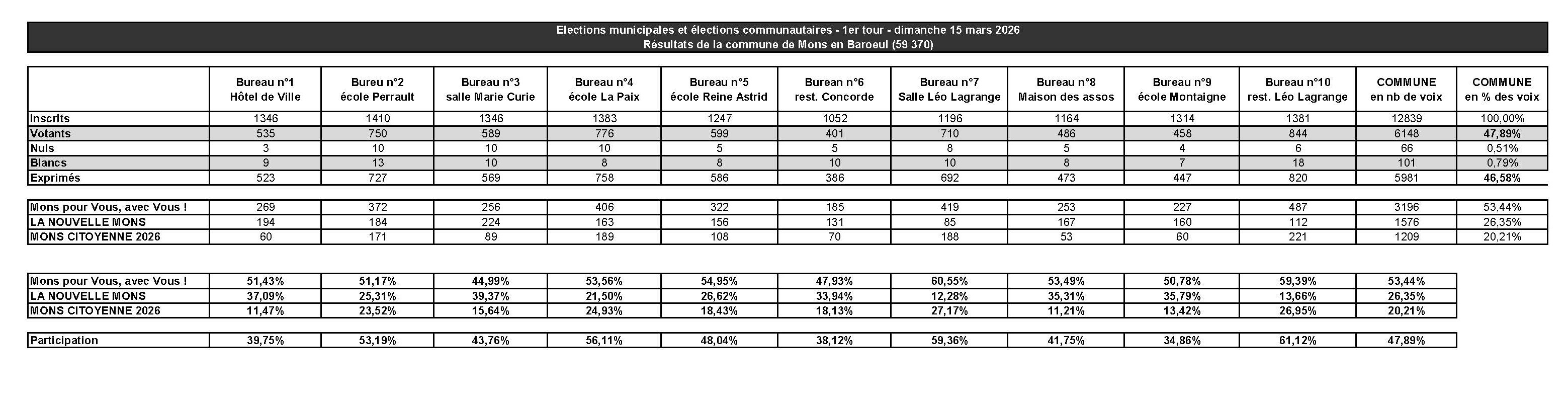 - 28 élus pour la liste majoritaire "Mons pour Vous, avec Vous !" dont 3 élus qui représenteront Mons-en-Baroeul au conseil communautaire MEL