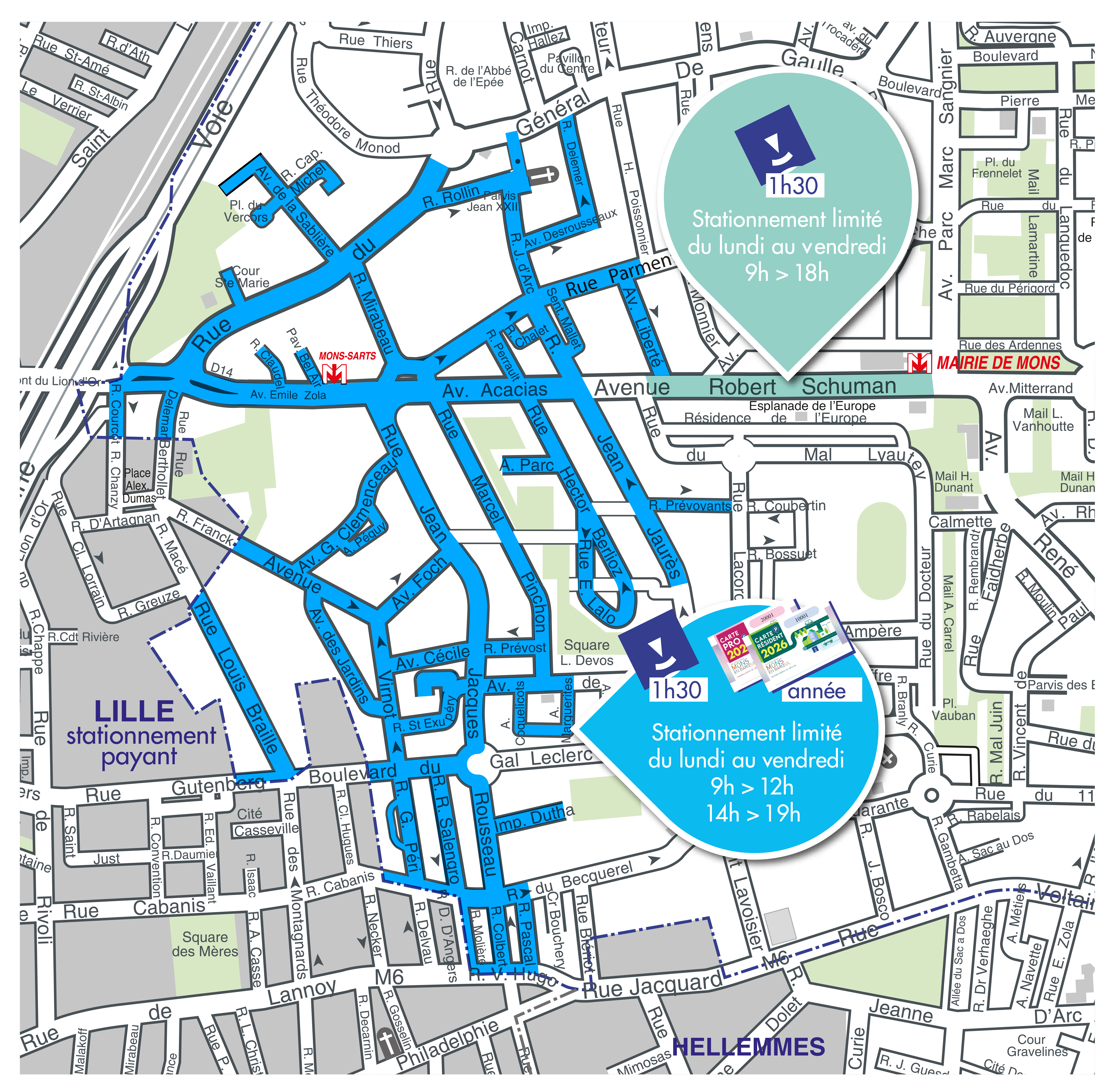 Suite à la décision de la Ville de Lille de généraliser le stationnement payant sur son territoire, la Ville de Mons en Barœul a mis en place une zone de stationnement à durée limitée sur une partie de son territoire le 1er janvier 2025. L’objectif est de limiter les effets du report du stationnement de Lille vers Mons en Baroeul et de permettre aux habitants des secteurs les plus impactés de pouvoir continuer à stationner leur véhicule à distance raisonnable de leur domicile.