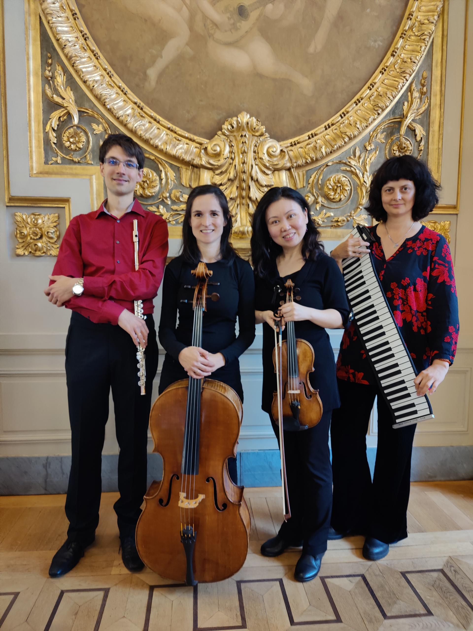 Avec Xin Guérinet (violoniste de l'ONL), Ana Giurgiu (pianiste), Morgane de Lafforest (violoncelliste de l'ONL) et Máté Bán (flûtiste, lauréat des concours internationaux)