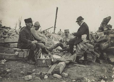 Sur cette photo, Georges Clemenceau et son fils Michel, capitaine au 6ième corps de l'armée coloniale, pique-niquent sommairement installés sur les ruines d'une église lors de l'une de ses visites sur le front.