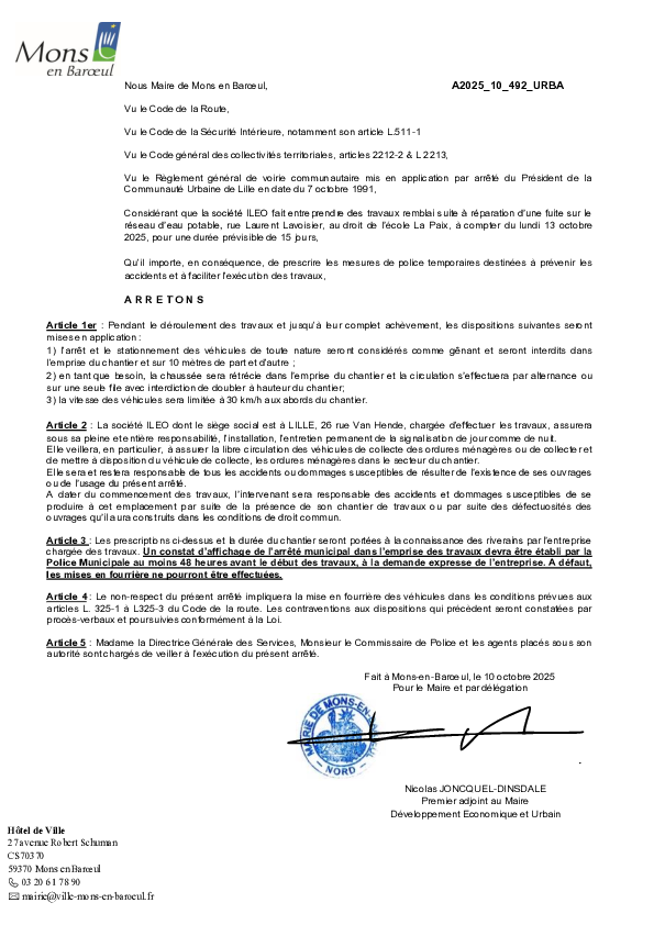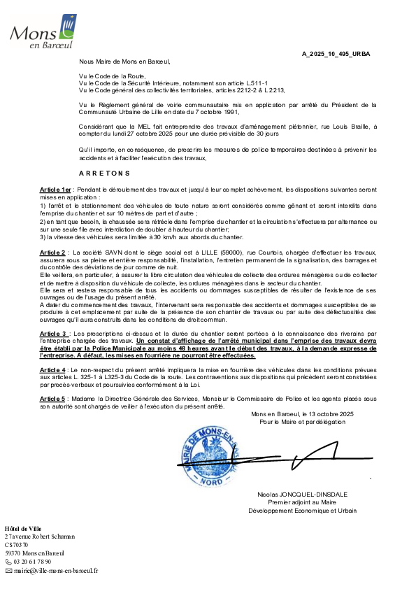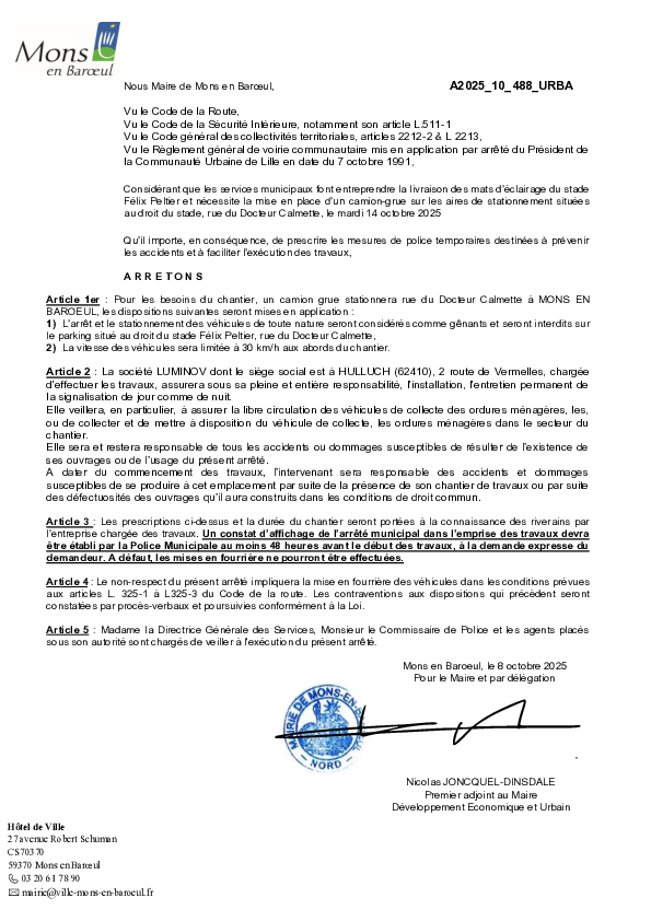 arrêté portant sur la fermeture provisoire du Fort de Mons en Baroeul