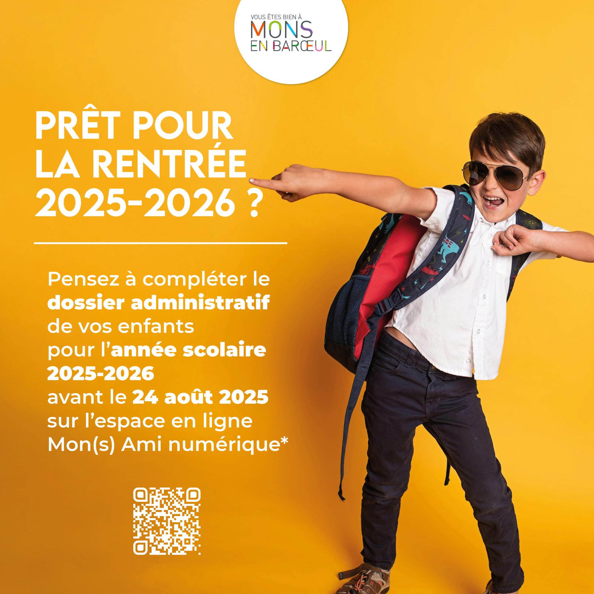 Jusqu'au dimanche 24 août, rendez-vous sur Mon(s) AMI Numérique [1] ou directement au guichet du service AMI pour remplir votre dossier administratif afin d'être prêt pour la rentrée scolaire de votre enfant le 1er septembre. Pour un enfant inscrit à l'école en début d'année dans le cadre d'une première rentrée ou d'un déménagement, l'inscription au dossier administratif n'est pas nécessaire. L'inscription et la réservation aux activités pouvant être faits directement dans ce cas.