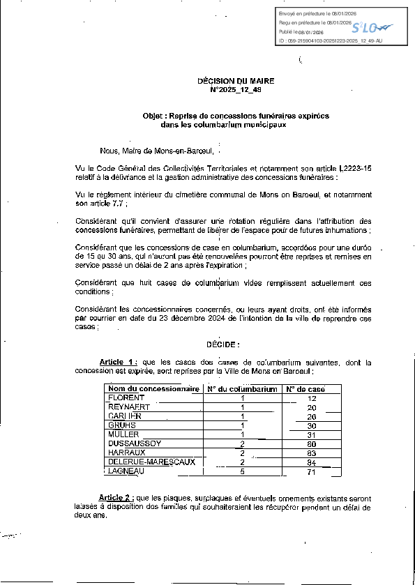 Reprise de concessions funéraires expirées dans les columbarium municipaux