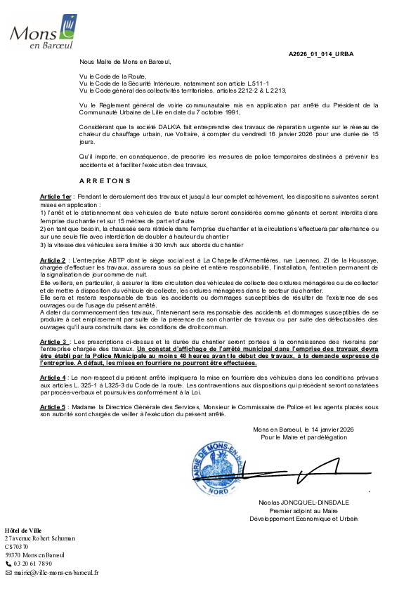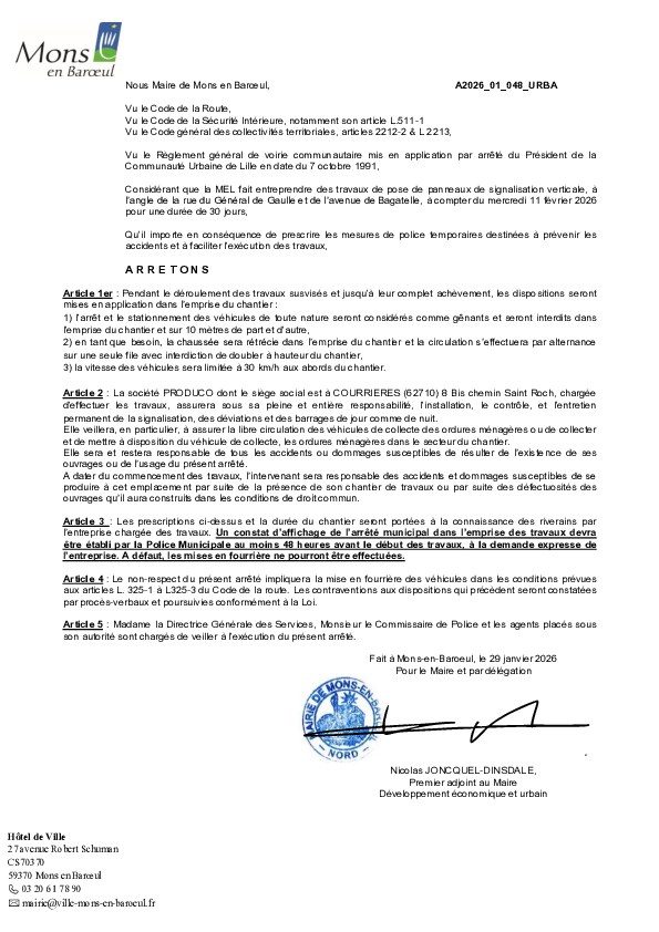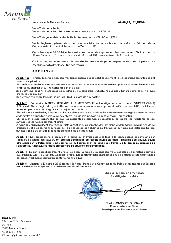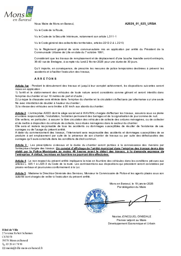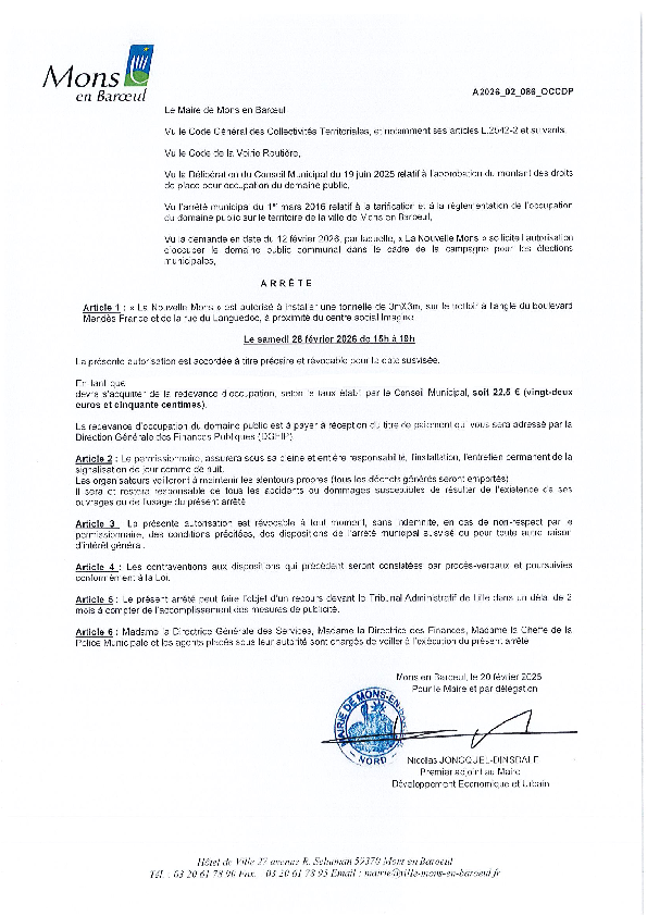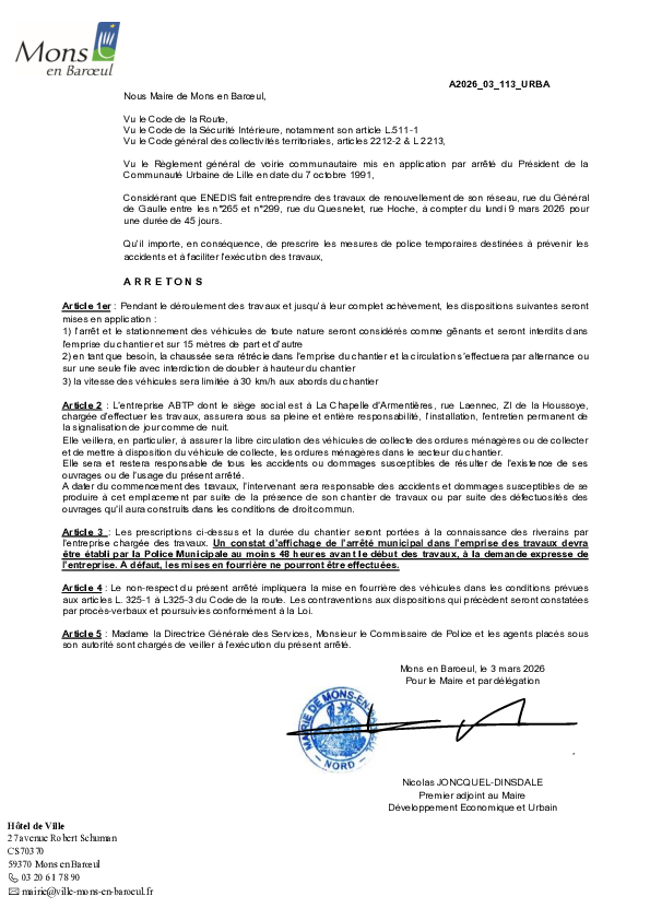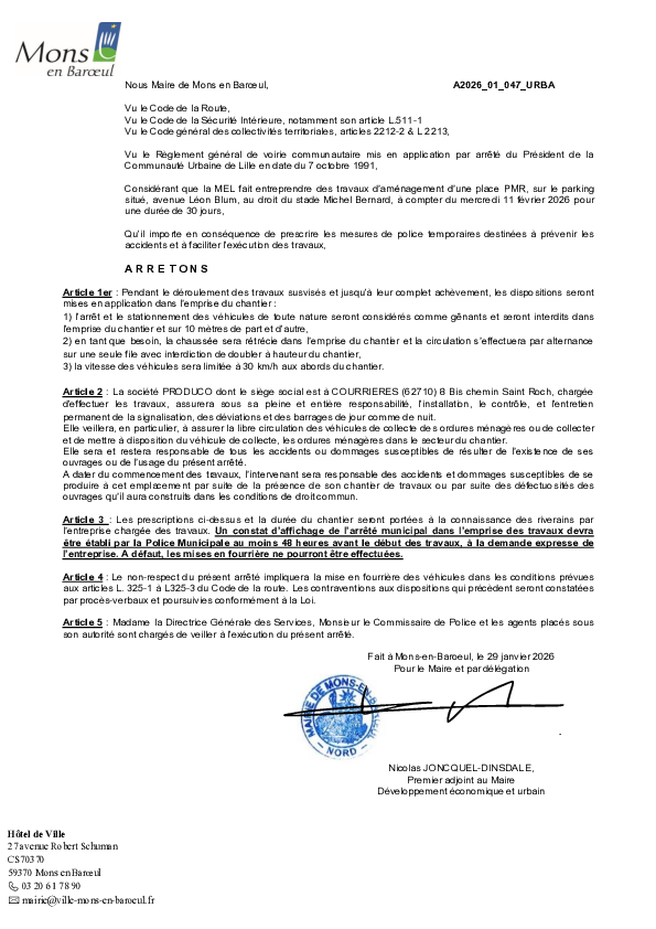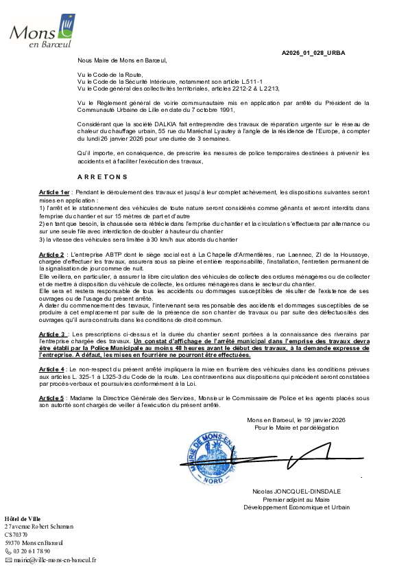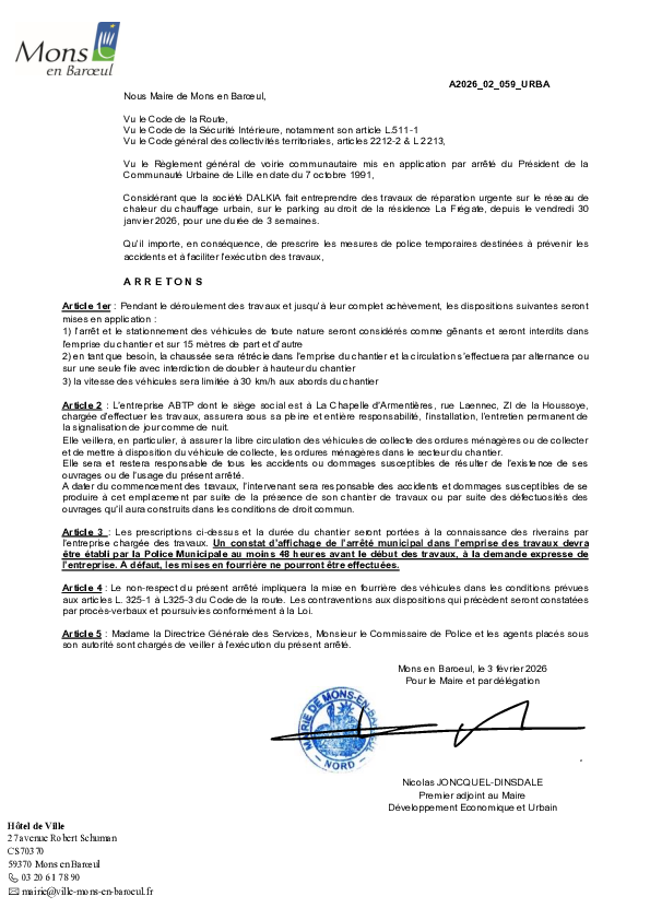 arrêté portant sur la fermeture provisoire du Fort de Mons en Baroeul