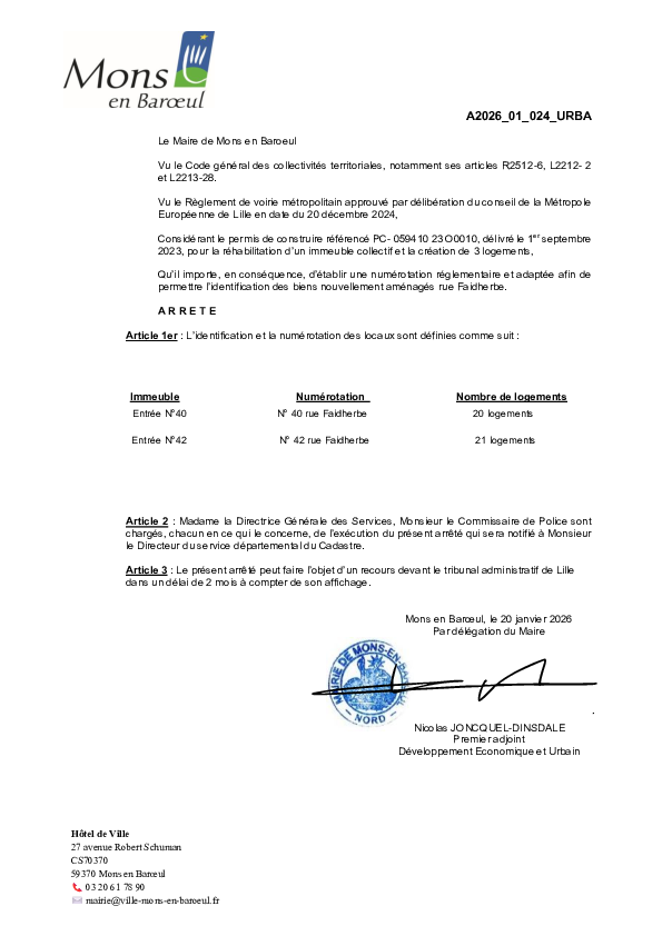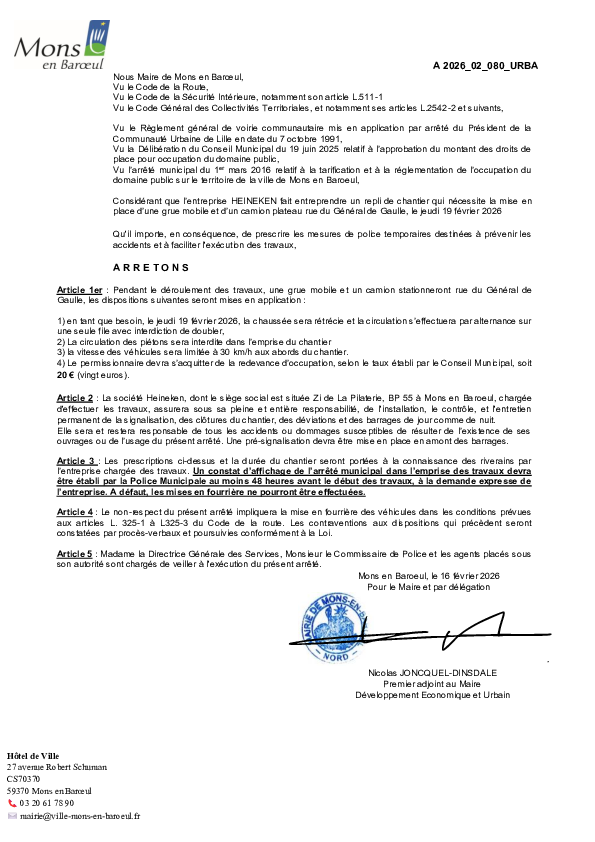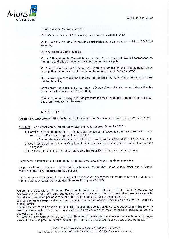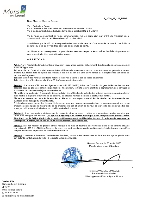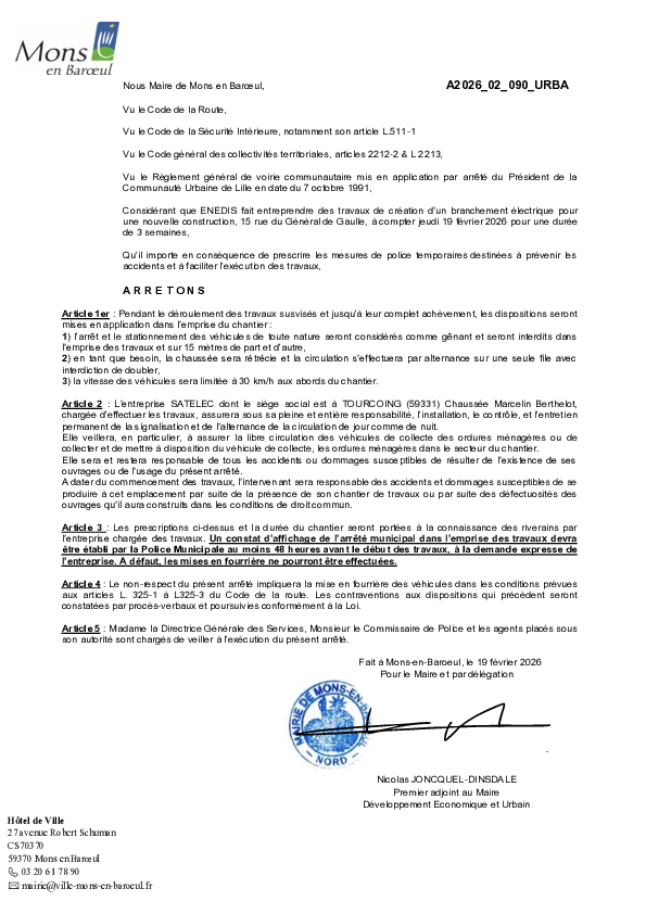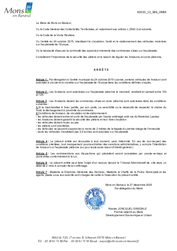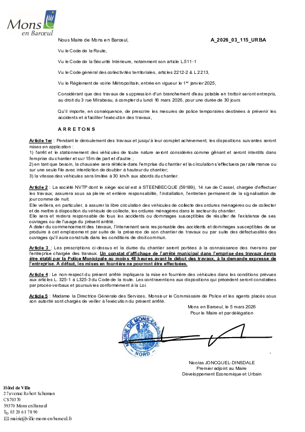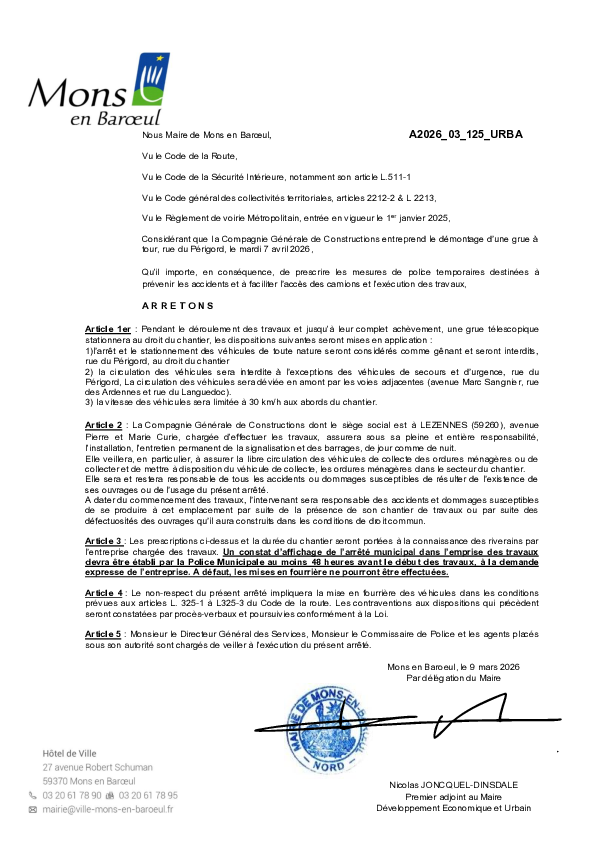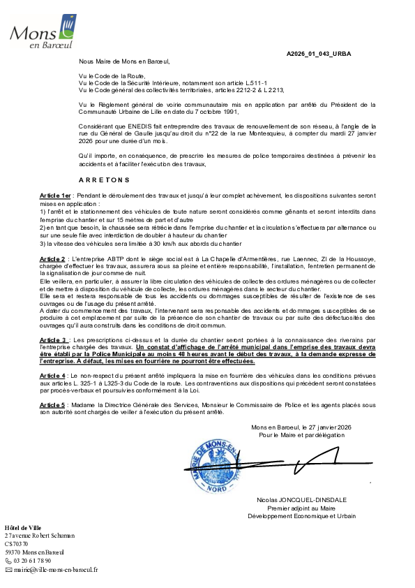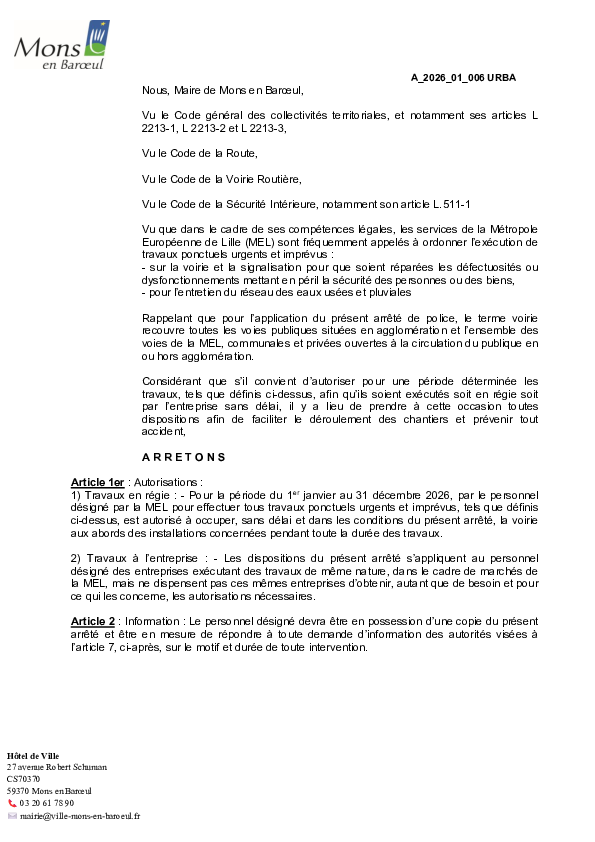 arrêté portant sur la fermeture provisoire du Fort de Mons en Baroeul