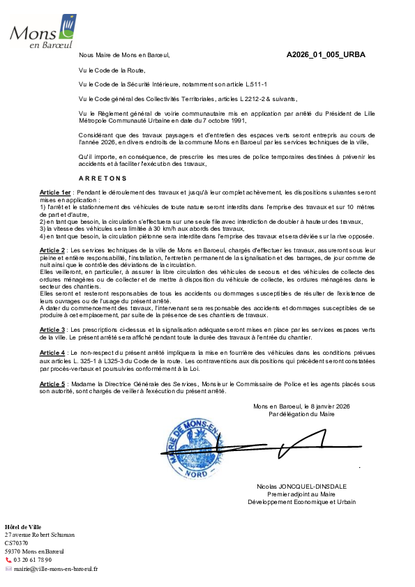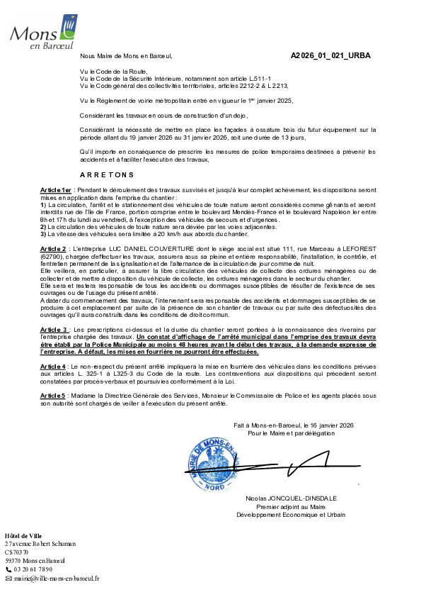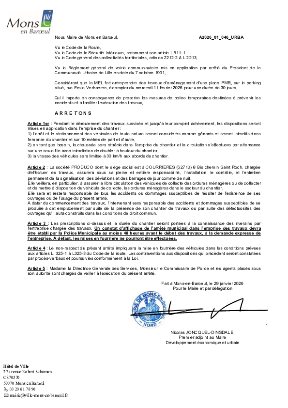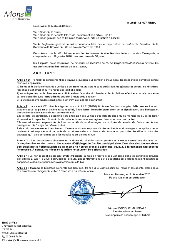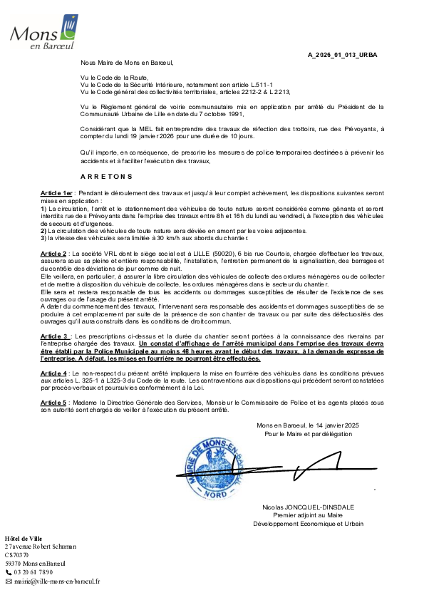 A2026-01-013 Restriction de circulation et stationnement Rue des Prévoyants