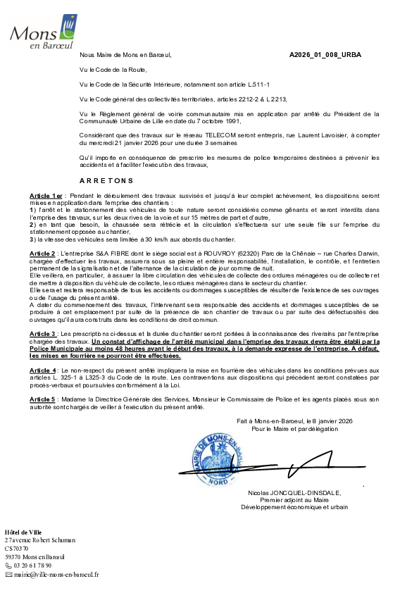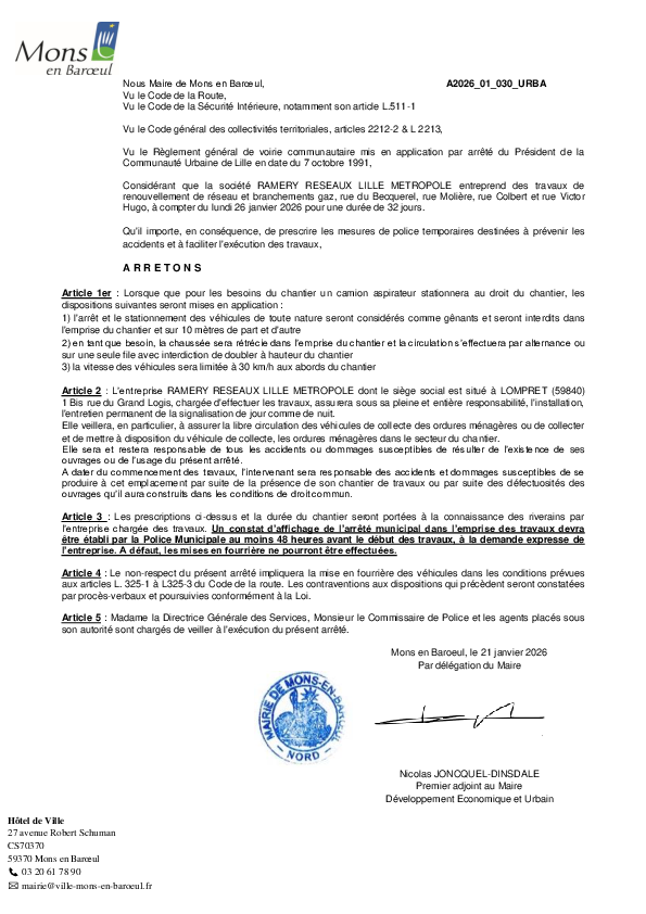 A2026-01-030- Restriction de stationnement rue du Becquerel, rue Colbert et rue Victor Hugo
