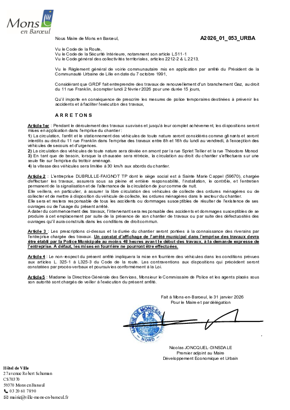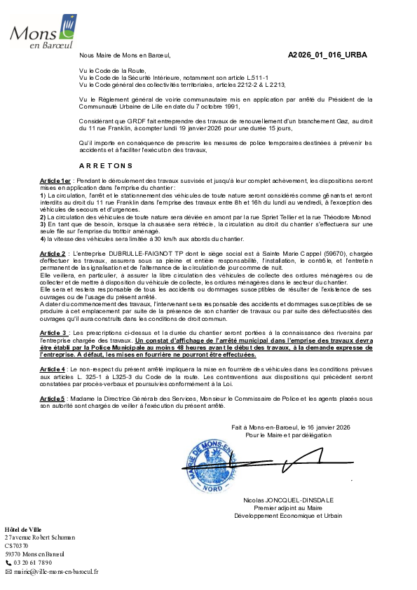 A2026-01-016 Restriction de circulation et stationnement rue Franklin