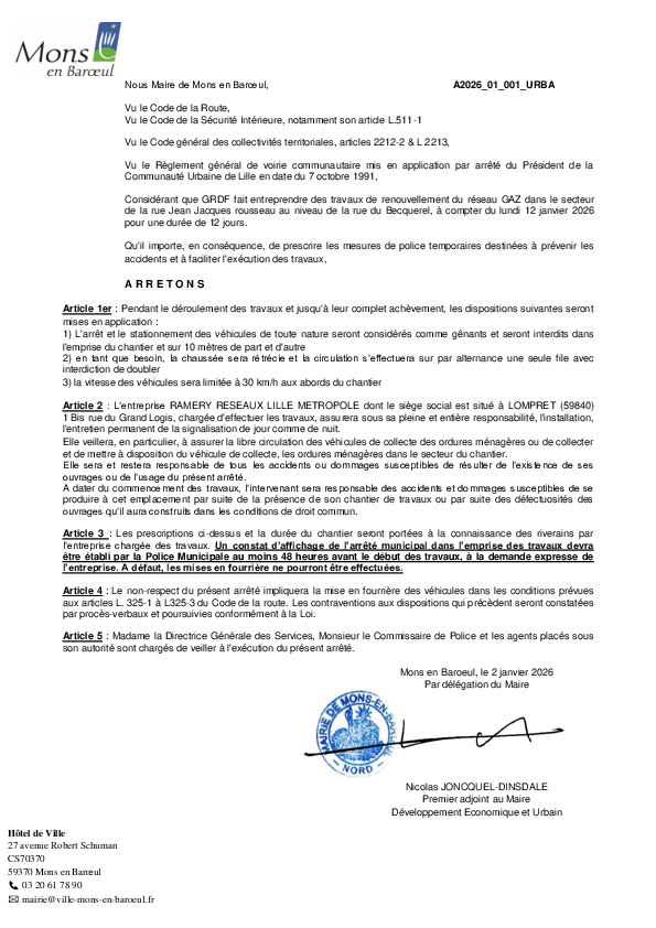 A2026-01-001 Restriction de stationnement rue Jean Jacques Rousseau et rue du Becquerel