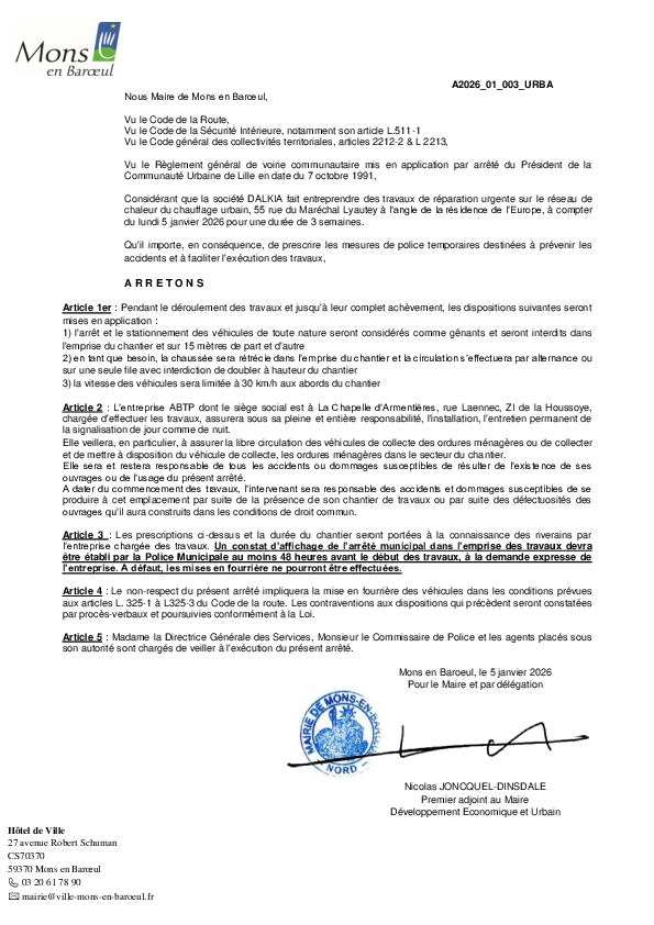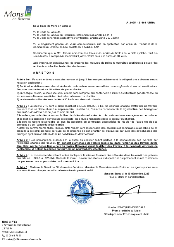 A2025-11-567 Restriction de stationnement Avenue Verdun, Liberté, Robert Schuman, Rues Jeanne Parmentier, Voltaire, Louis Braille et du Général de Gaulle