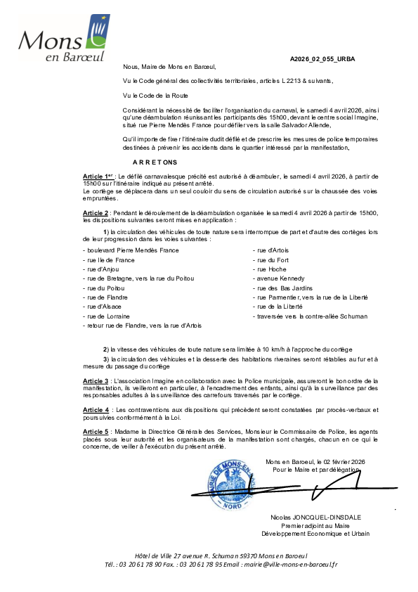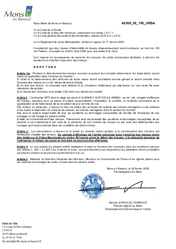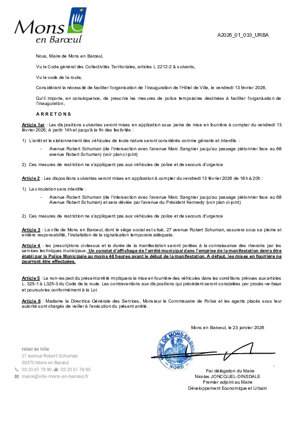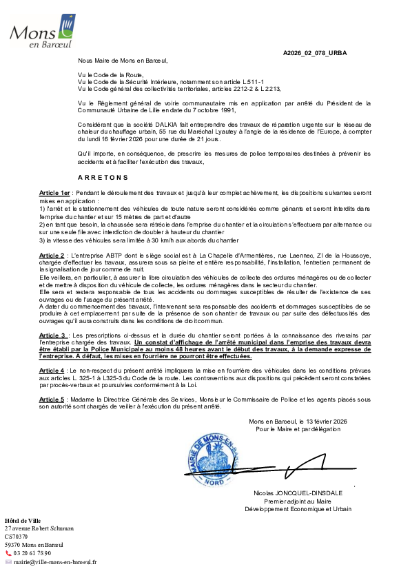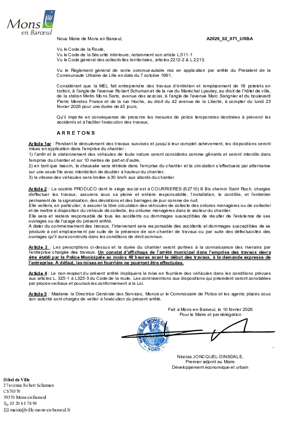 A2026-02-071 Restriction de stationnement avenues Robert Schuman, des acacias, Marc Sangnier, boulevard Pierre Mendes France et rue Hoche