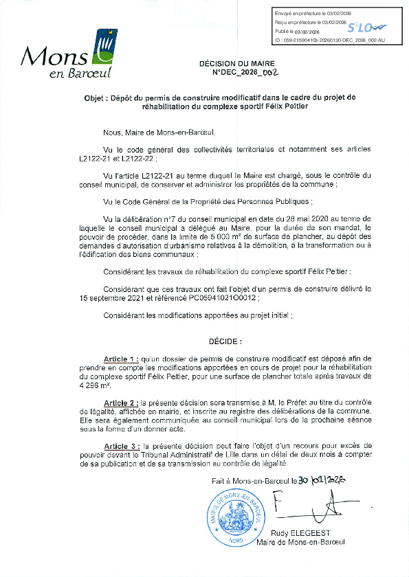 DEC_2026_002 Dépôt du permis de construire modificatif dans le cadre du projet de réhabilitation du complexe sportif Félix Peltier
