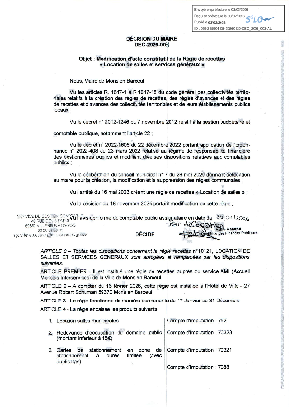DEC_2026_003 Modification d'acte constitutif de la régie de recettes "Location de salles et services généraux"