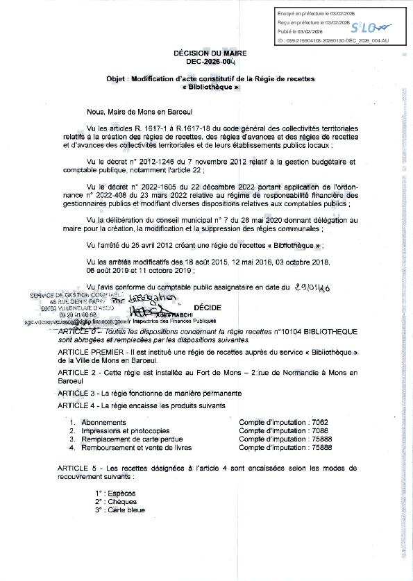 DEC_2026_004 Modification d'acte constitutif de la régie de recettes "Bibliothèque"