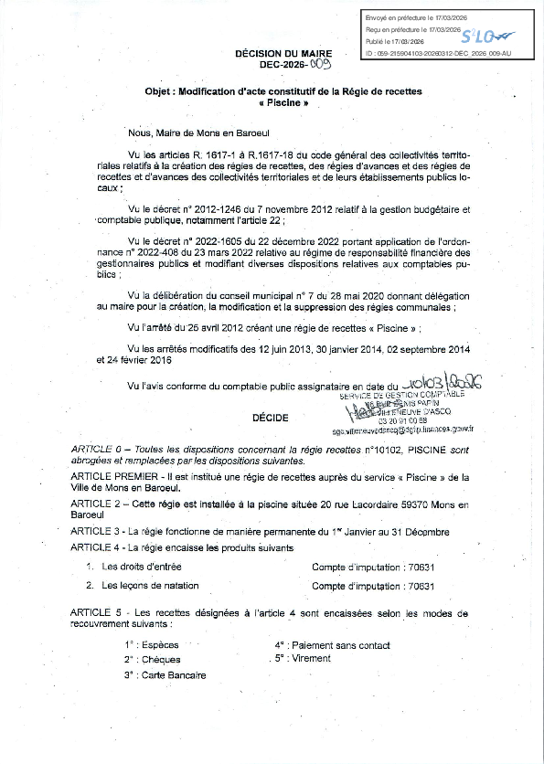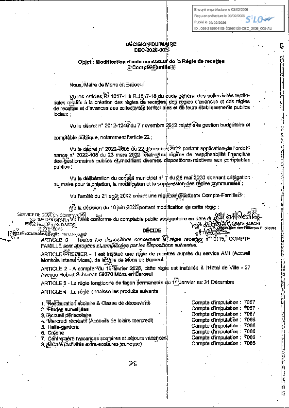 DEC_2026_005 Modification d'acte constitutif de la régie de recettes "Compte famille"