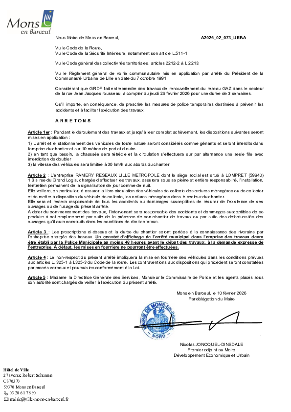 A2026-02-073 Restriction de stationnement rue Jean Jacques Rousseau