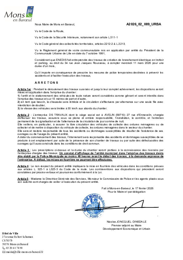 A2026-02-089 Restriction de stationnement rue Jean Jacques Rousseau