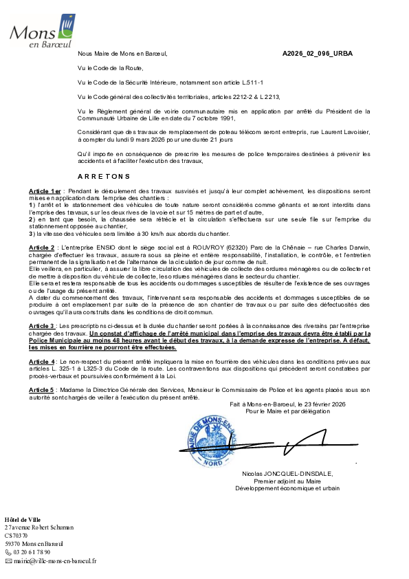 A2026-02-060 Restriction de stationnement rues Laurent Lavoisier, Voltaire, Lacordaire et avenue René Coty