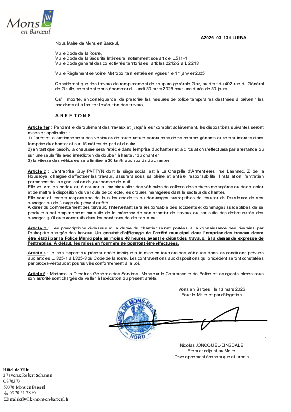 A2026-03-134 Restriction de stationnement 402 rue du Général de Gaulle