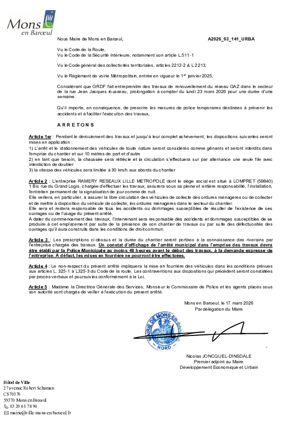 A2025-10-519 Restriction de circulation et stationnement Rue Jean Jacques Rousseau, avenue Georges Clémenceau et rue du Becquerel
