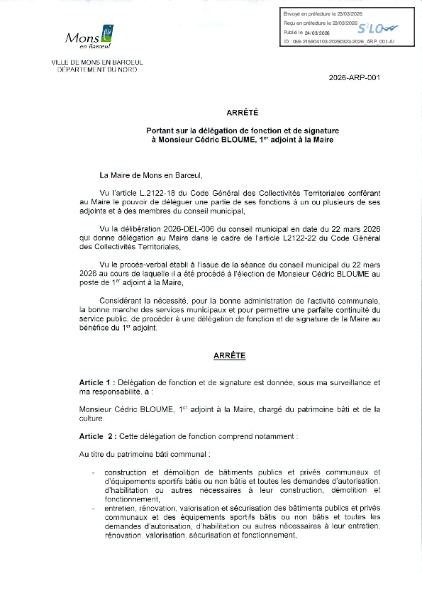 Délégation de fonction et de signature à M. Cédric BLOUME-1er adjoint