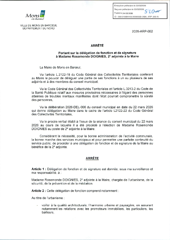 Délégation de fonction et de signature à Mme Rosemonde DOIGNIES-2e adjoint