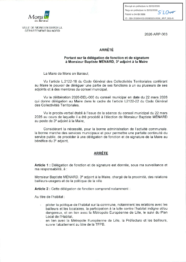 Délégation de fonction et de signature à M. Baptiste MENARD-3e adjoint