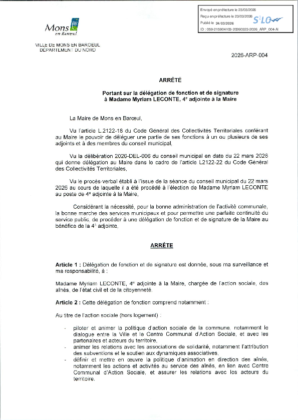 Délégation de fonction et de signature à Mme Myriam LECONTE-4e adjointe
