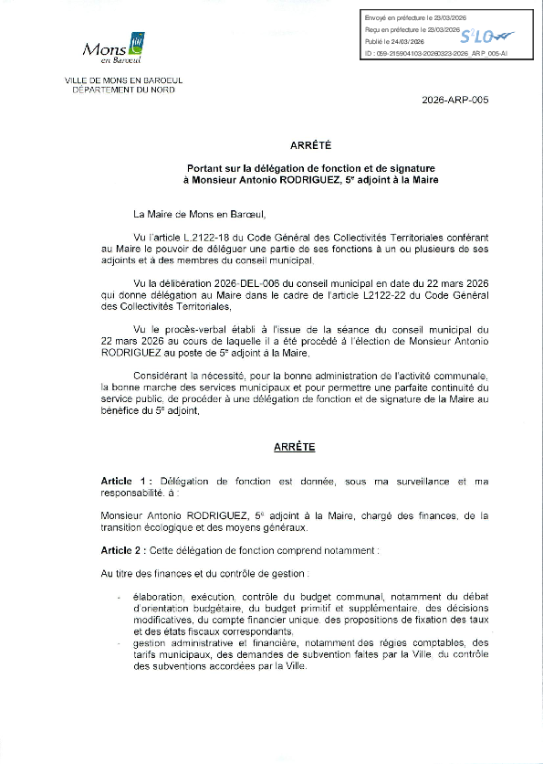 Délégation de fonction et de signature à M. Antonio RODRIGUEZ-5e adjoint
