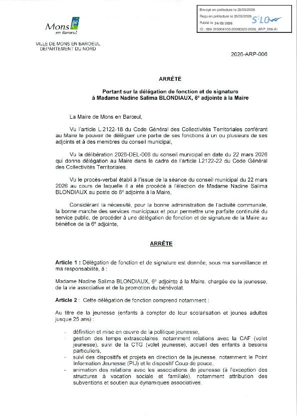 Délégation de fonction et de signature à Mme Nadine Salima BLONDIAUX-6e adjointe