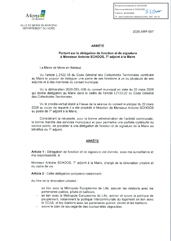 Délégation de fonction et de signature à M. Antoine SCHOOS-7e adjoint