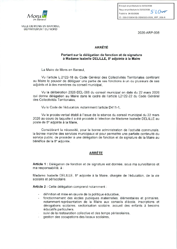 Délégation de fonction et de signature à Mme Isabelle DELILLE-8e adjointe
