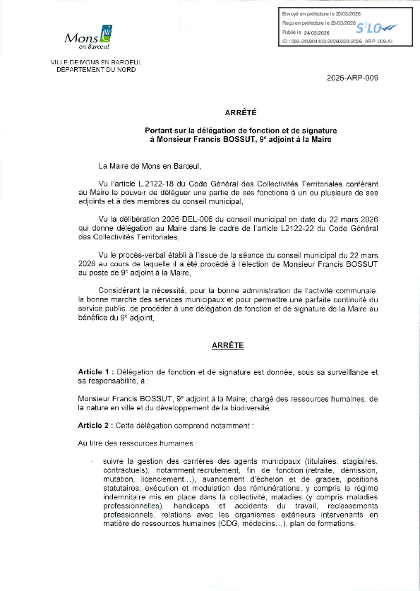 Délégation de fonction et de signature à M. Francis BOSSUT-9e adjoint