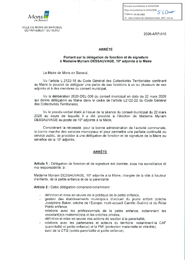 24.09.10 - Arrêté portant sur une délégation de fonction et signature à Madame Doignies