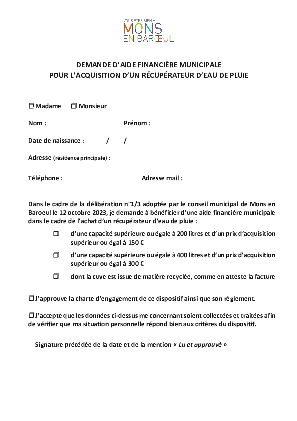 La ville souhaite encourager par une aide financière ceux qui le peuvent à installer chez eux des récupérateurs d'eau pluviales leur permettant d'arroser leurs plantations, laver leurs outils ou leur voiture ou donner à boire aux petits oiseaux sans consommer d'eau de ville.