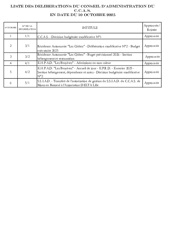 CA du CCAS 10 octobre 2025 - Liste des délibérations
